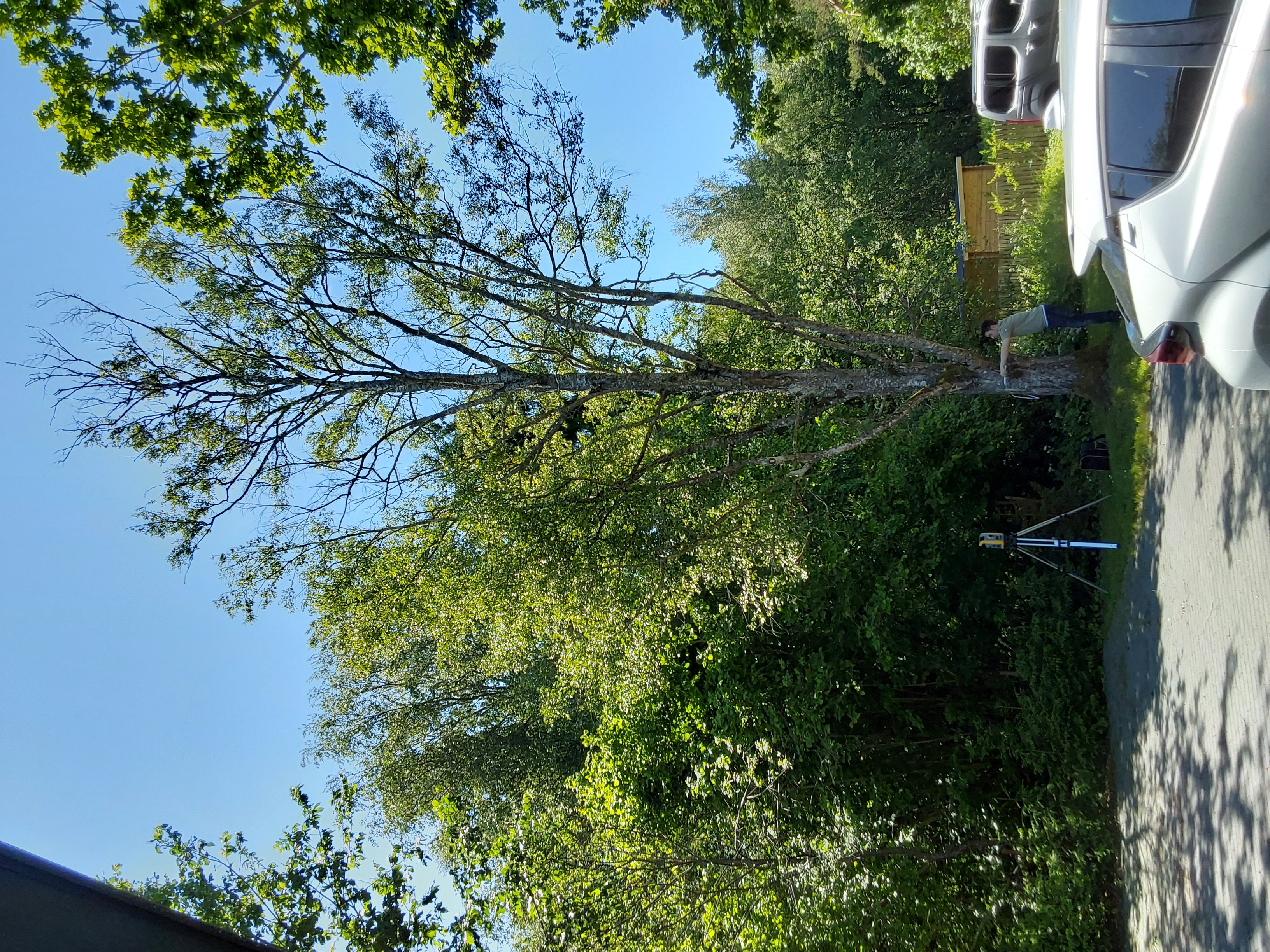 Kahjustatud puu raie | Likvideeritav puu (V väärtusklass) | Ca 50 % puust on kuivanud oksad, sh puu ladvas. Pool kuiv. | Kärbi 12a kask D50.jpg |