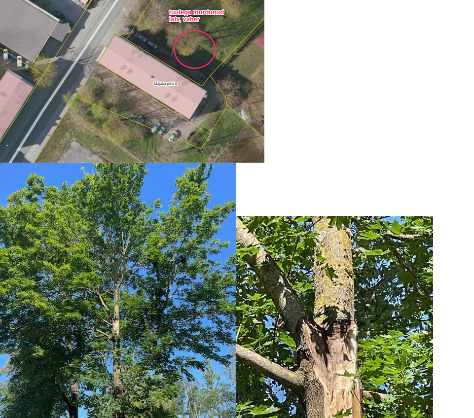 Ohtlik puu või ohtlik oks | Tormiga murdus kaheharuline latv, alles jäänud osa on ohtlik. | Majaka põik 8a vaher.png |