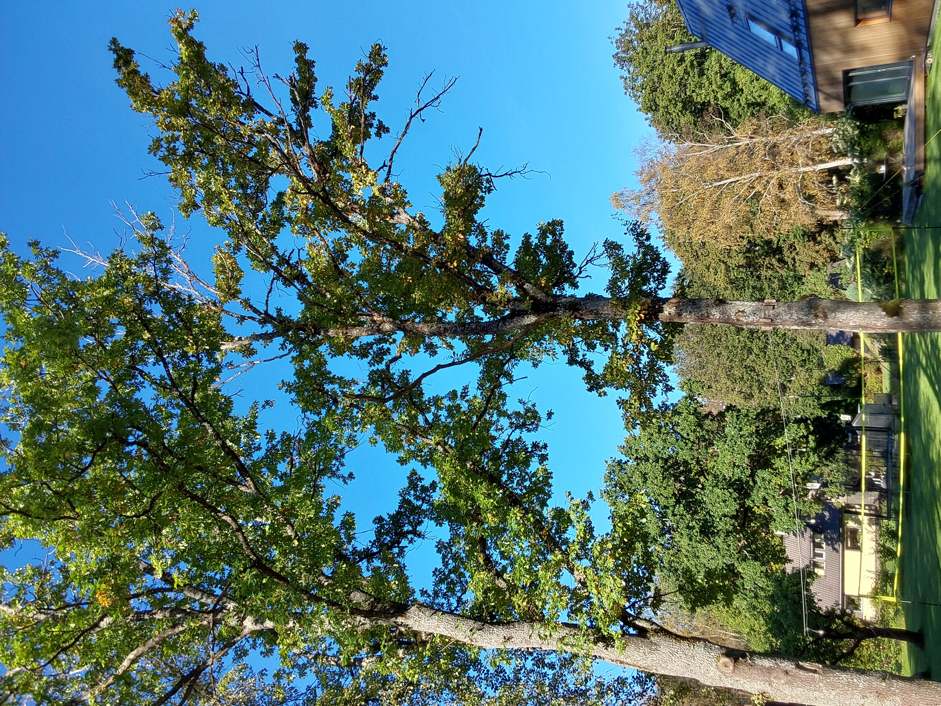 Kahjustatud puu raie | Võras palju kuivanud oksi, alla jäänud kõrval kasvavale tammele. | Lauka 13 tamm d45.jpg |