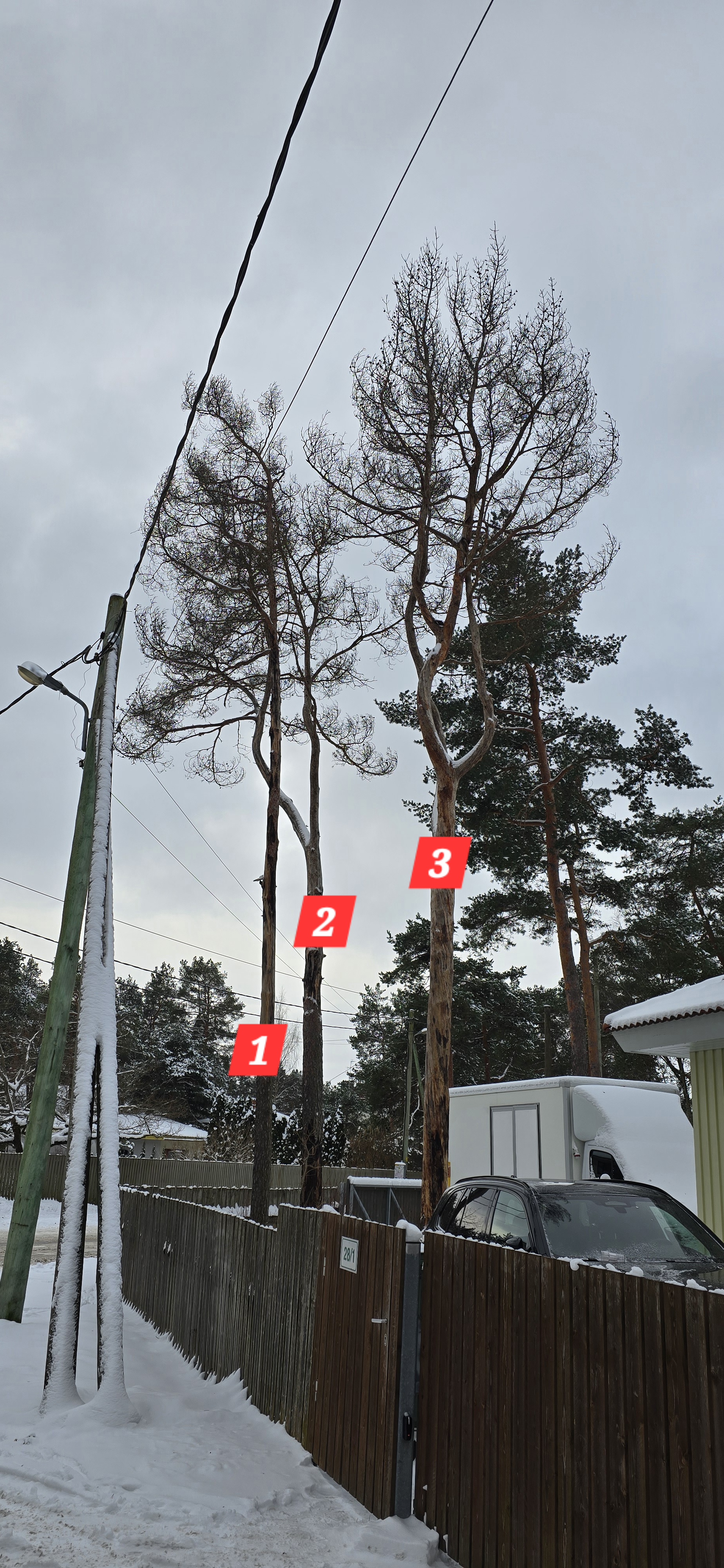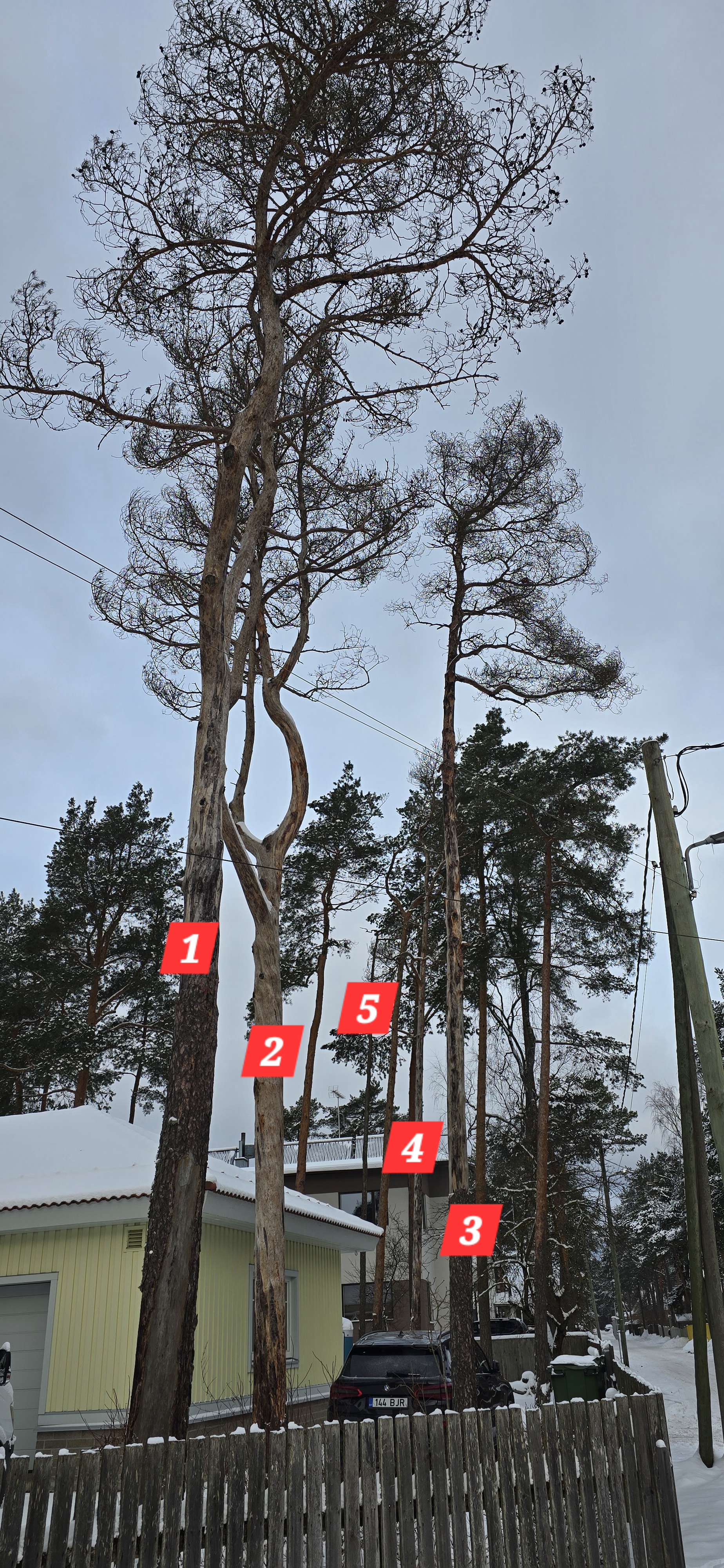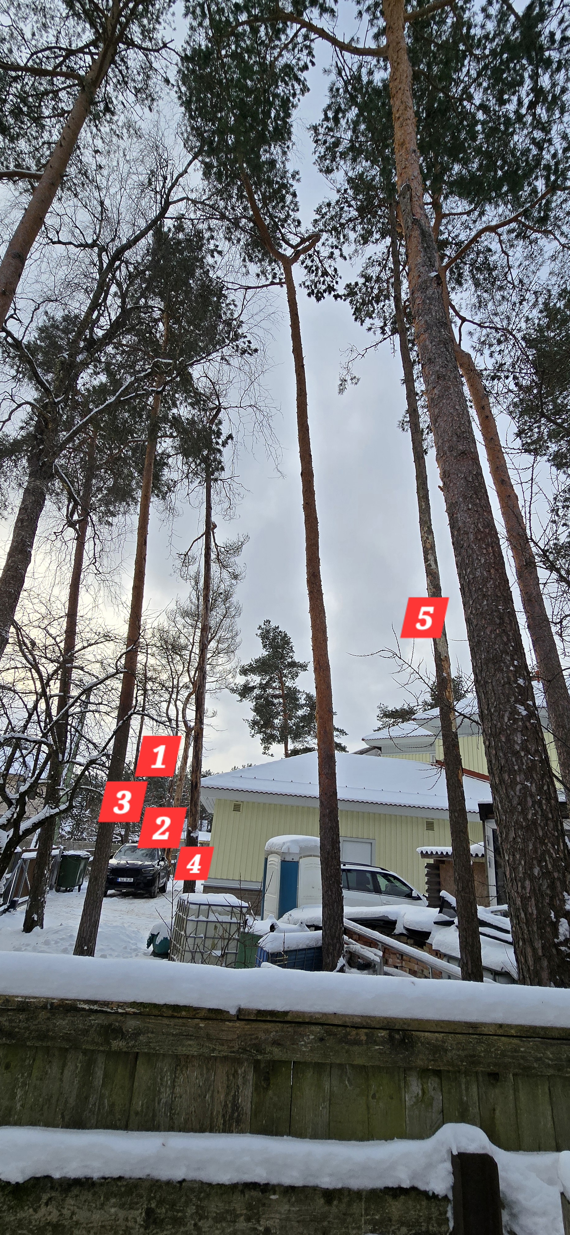 Ohtlik puu või ohtlik oks | 5 mändi mulle kuuluval kinnistul on täielikult kuivanud, koor on terve tüve ulatuses eemaldunud jmt. | 20260109_103450.jpg 20260109_103724.jpg 20260109_103804.jpg 20260109_105112.jpg 20260109_105316.jpg |